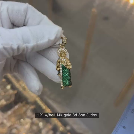 This 1.9-inch 3D pendant of San Judas is crafted in 14k gold with an integrated bail for easy attachment to chains. Its detailed design captures the spiritual significance of San Judas, making it a meaningful accessory. Expertly fashioned for both durability and refined appearance, it balances artistic craftsmanship with everyday wearability.
