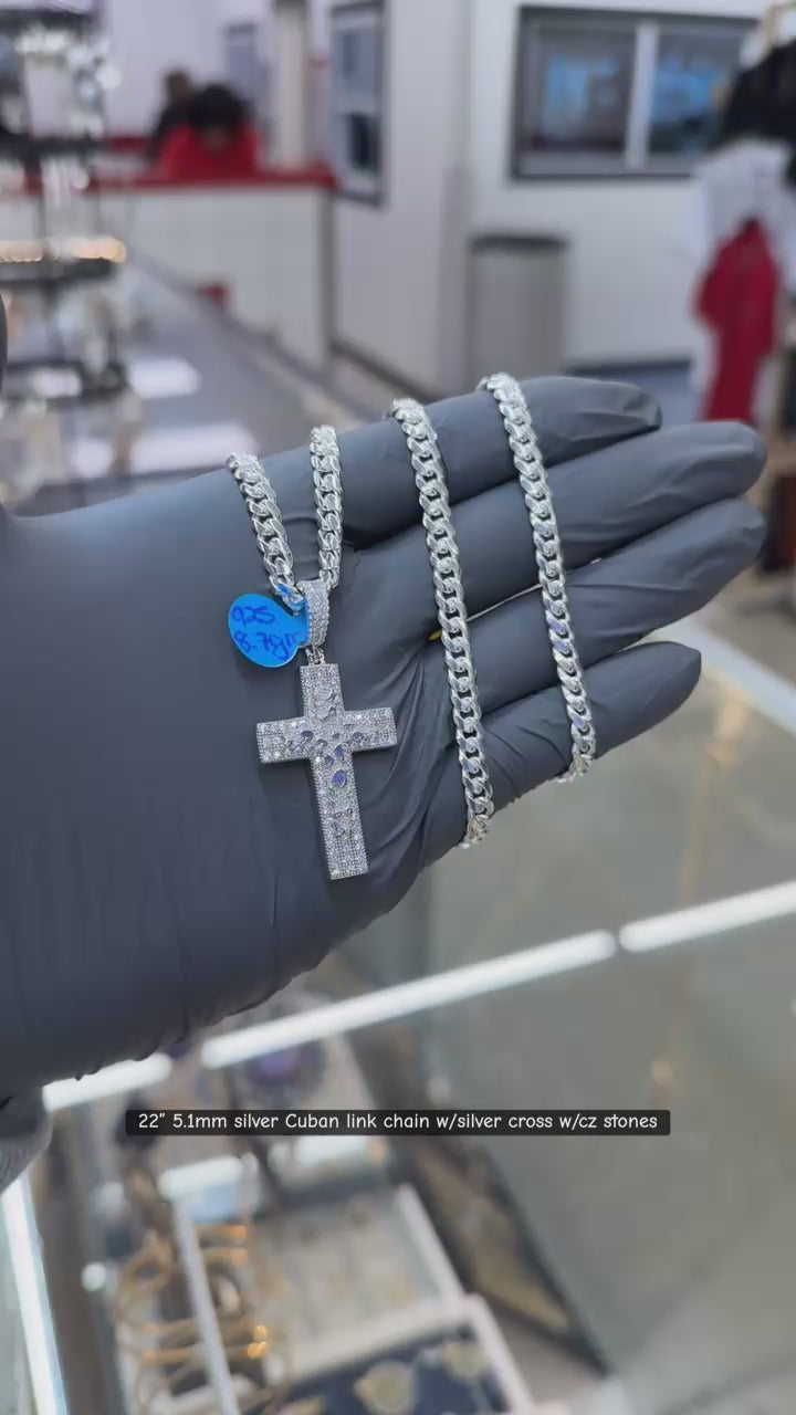22" 5.1mm silver Cuban link chain w/silver cross w/cz stones