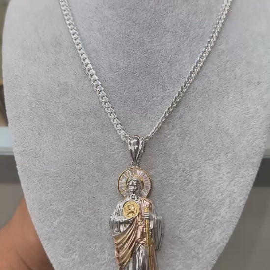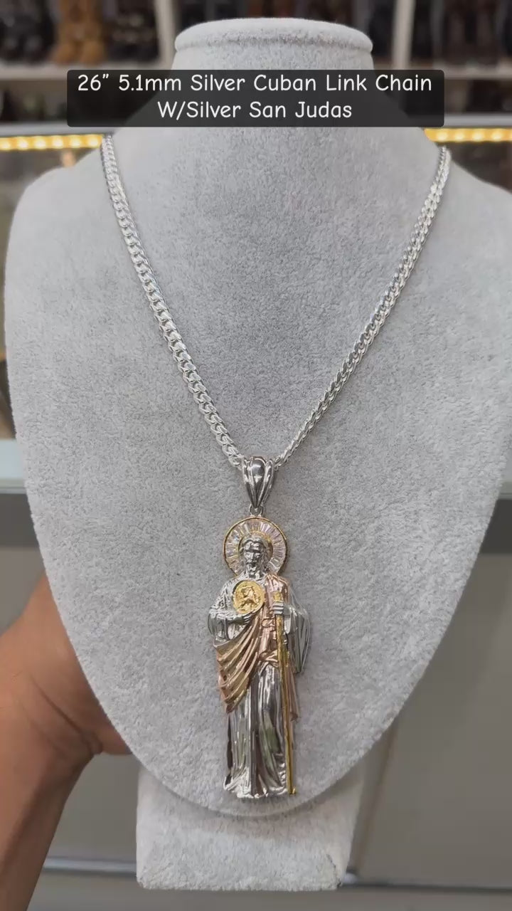 26” 5.1mm Silver Cuban Link Chain W/Tri color Silver San Judas Pendant